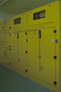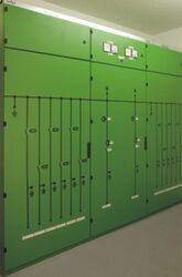 - Transformer room with hot-dip galvanized guide rails and track limiter rails, Halfen anchoring system flush-embedded in concrete, separating walls between the transformer rooms, basement oil-proof